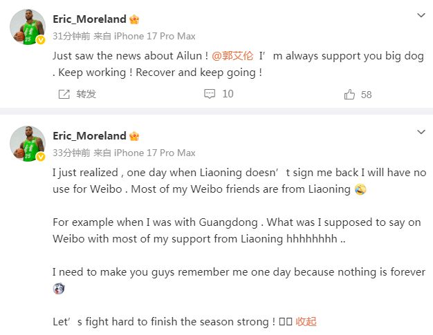 莫兰德还继续谈到自己本赛季重返辽宁男篮效力的感受:“我突然意识到,如果有一天辽宁男篮不再与我续约,我的微博可能就没什么用。我的大多数微博好友都来自辽宁,比如我在广东男篮效力时,面对大部分支持我的辽宁球迷,我在微博上该说什么?我需要让你们记住我,因为没有什么是永恒的。让我们一起努力,争取在赛季结束时取得好成绩!”