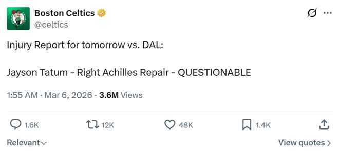 凯尔特人官方也第一时间更新公布球队伤病状况,塔图姆的状态从缺阵升级为出战成疑。